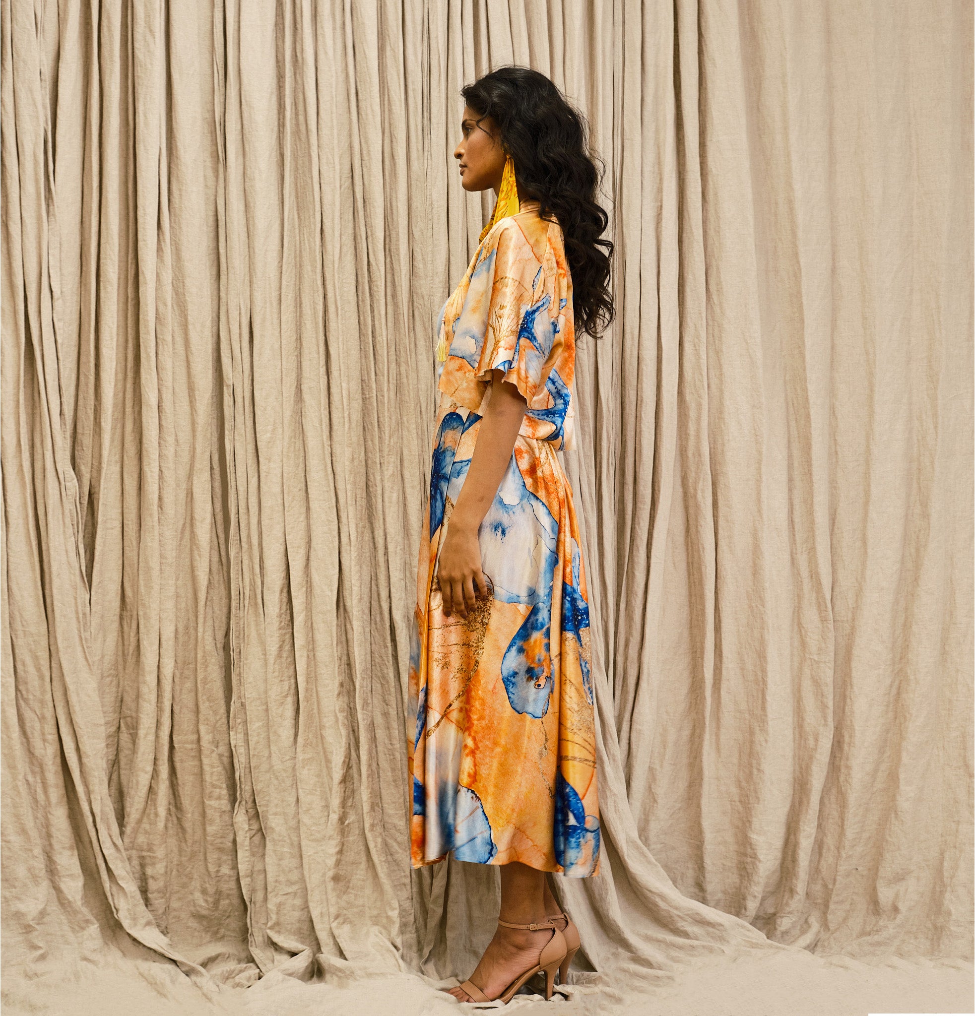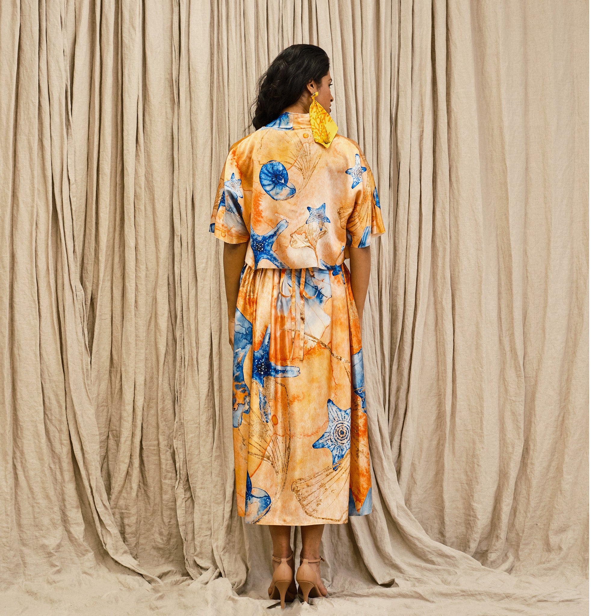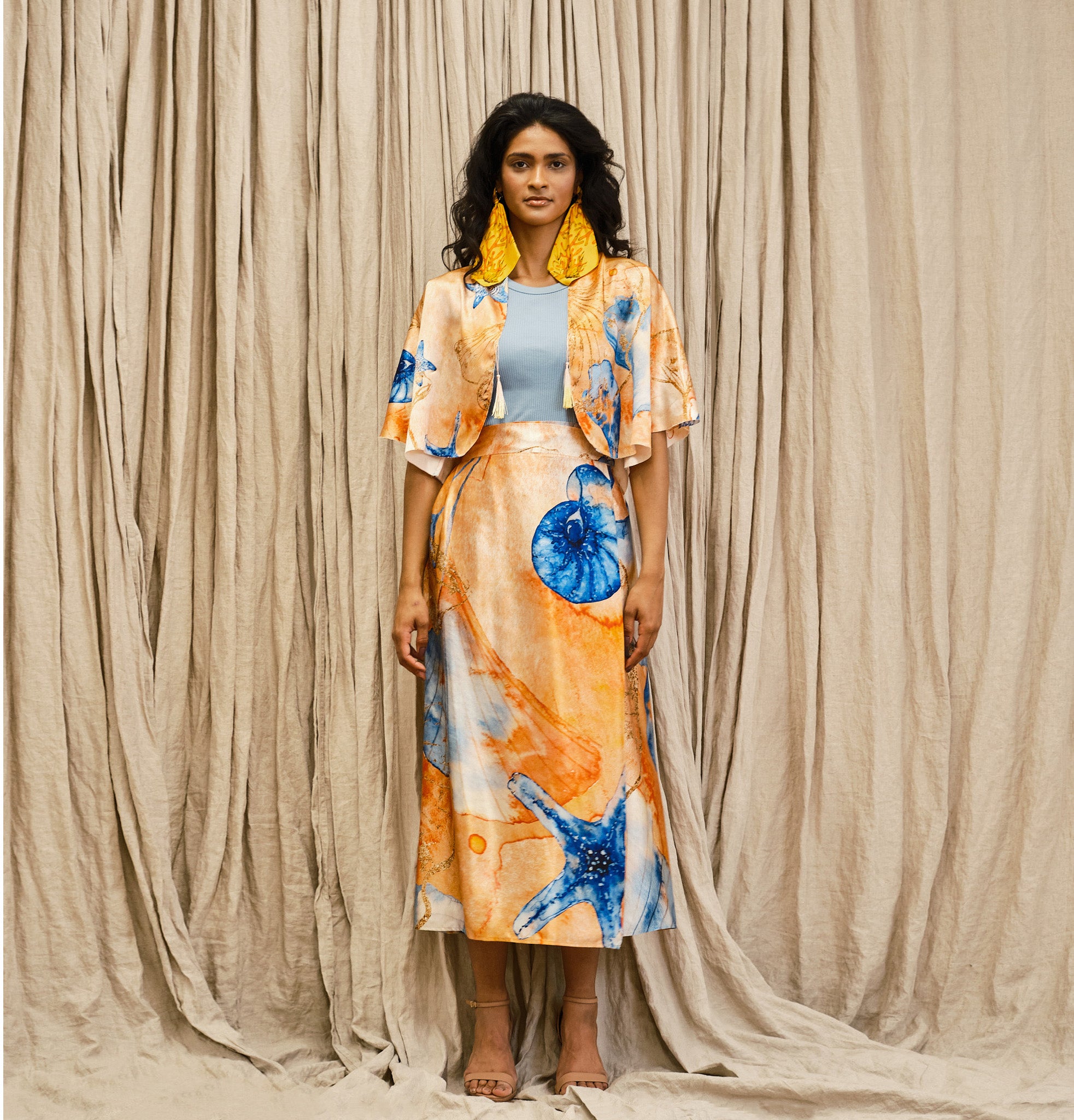 A made to order piece. The Soleil Two Piece Set is composed of a elbow-length cardigan, adorned with two side tassels, and a high waisted tie-adjustable pleated skirt.