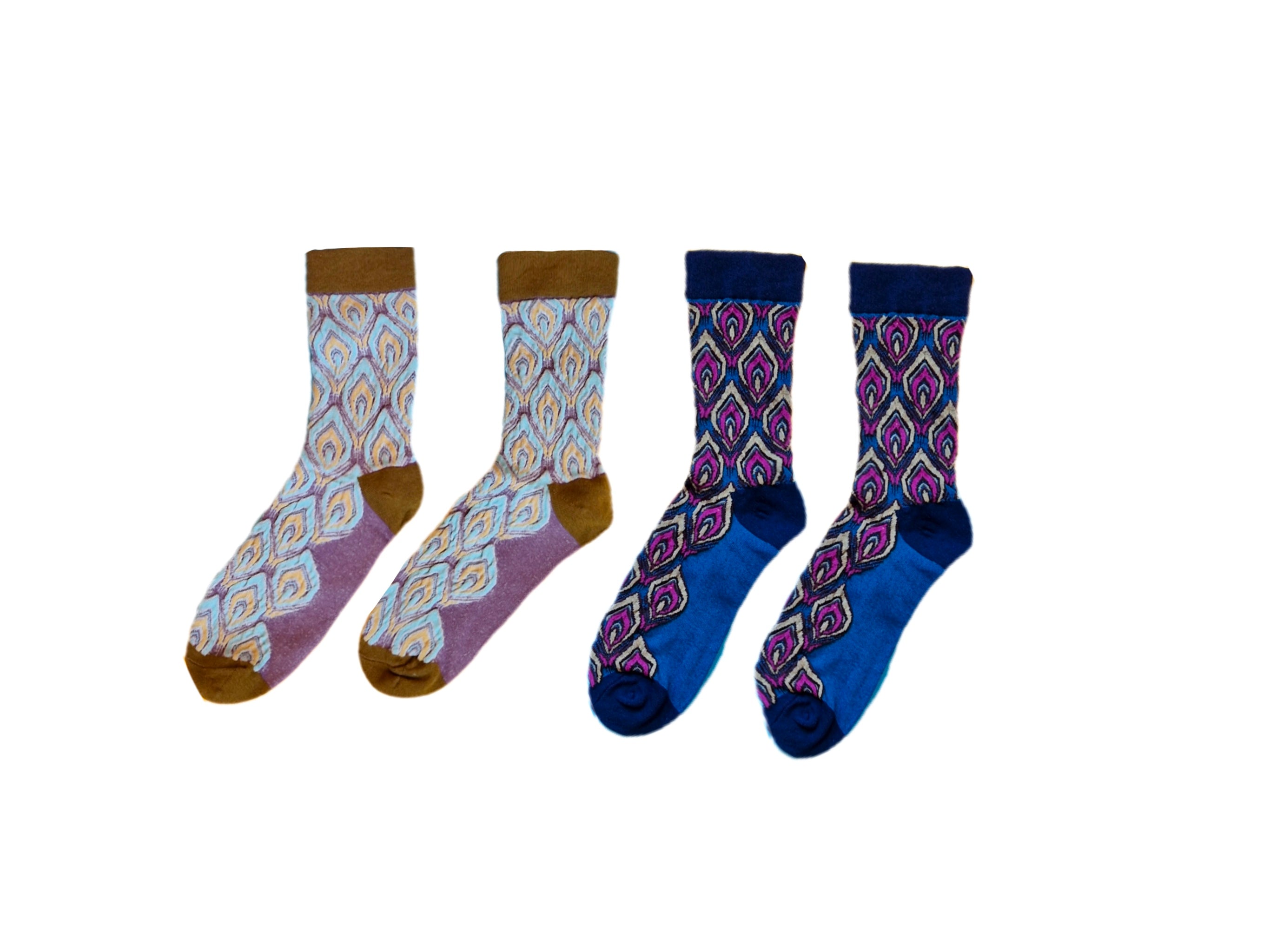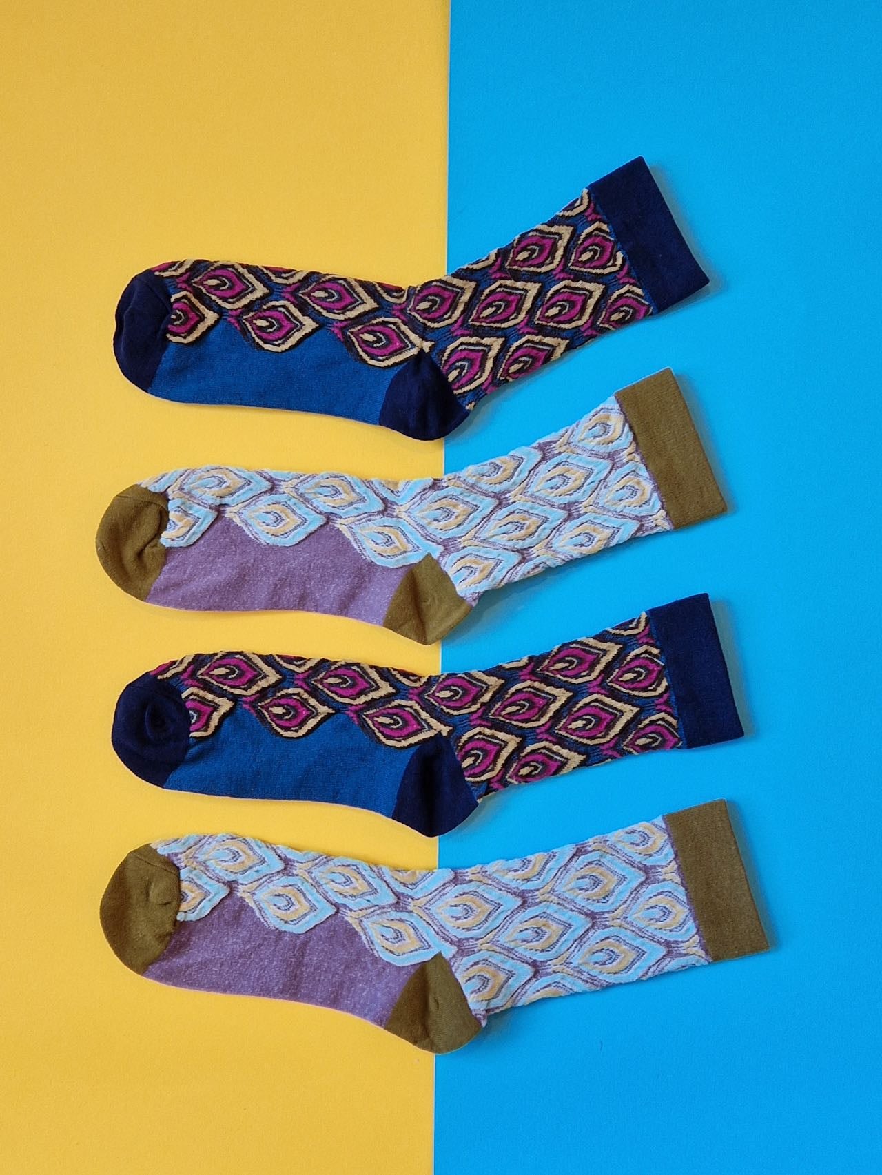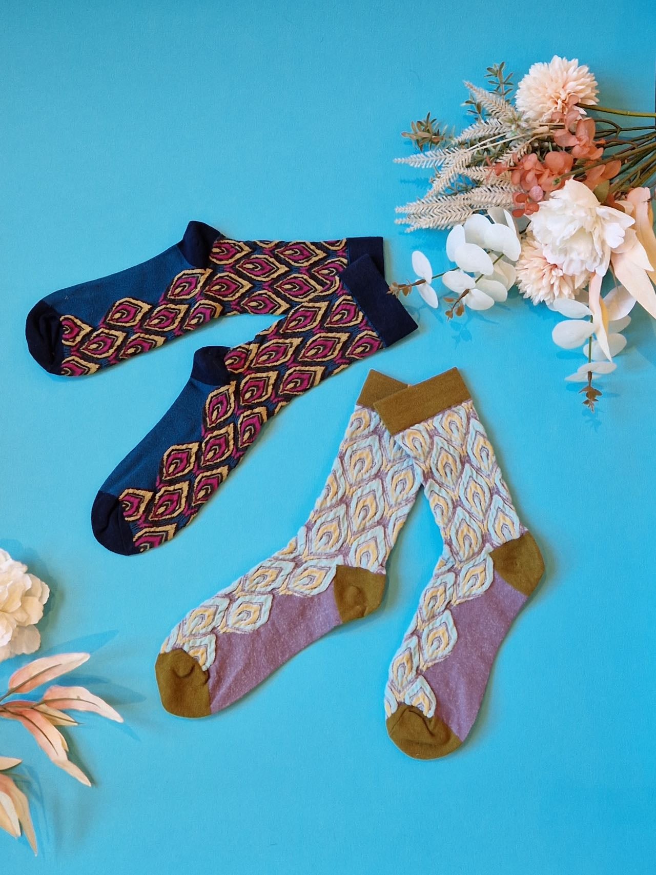 Crafted from high-quality, soft cotton, these socks offer both breathability and durability. Their unique design features a vibrant, intricately detailed peacock feather pattern that adds a touch of elegance and playfulness.