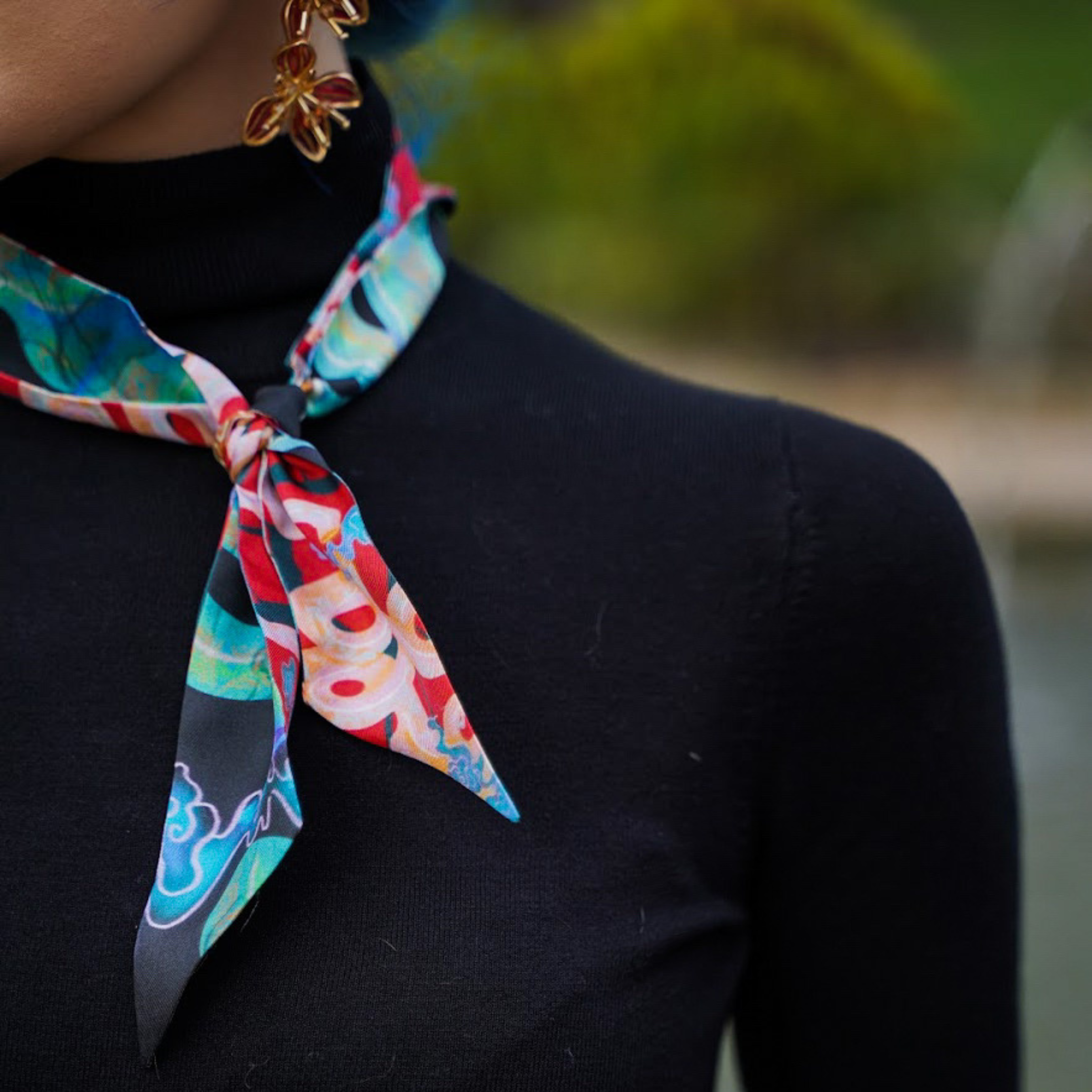 Turn heads with the Siren Soirée Silk Scarf, a statement accessory crafted from 100% luxurious silk with a double-sided print. Bold yet elegant, this small silk piece adds a refined, artistic touch to your everyday wardrobe. Perfect for tying around your neck, wrist, or handbag, effortless sophistication in every fold.